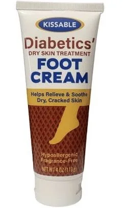 KISSABLE -Diabetics' Foot Cream 4 oz Active Ingredient Purpose Dimethicone 1% ...... Skin Protectant Petrolatum 30%........Skin Protectant Skin protectant Keep out of reach of children. If swallowed, get medical help or contact a Poison Control Center immediately. Use help prevent and temporarily protets chafed, chapped, or cracked skin. Warnings For external use only. When using this product avoid contact with eyes. In case of eye contact, flush with water. Do not use on deep or puncture wounds animal bites serious burns Stop use and ask a doctor if condition worsens. Symptoms last more than 7 days or clear up and occur again within a few days. Directions apply liberally as often as needed. Other information Store at room temperature. Inactive Ingredients Water, Ceterayl Alcohol, Glycerin, Isopropyl Myristate, DMDM Hydantoin, Carbomer, Sodium Hydroxide, Aloe Vera Leaf , Vitamin E. 2